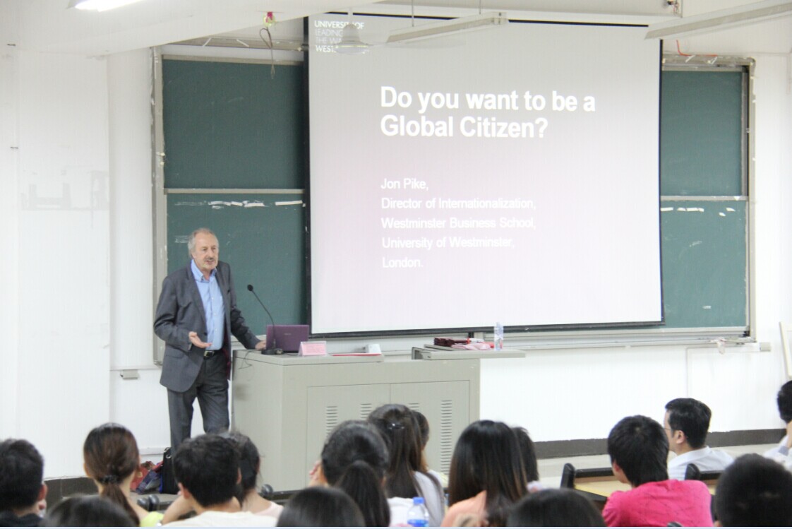 会后,派克先生为国际教育学院学生做了一场主题为“你想成为一个国际化公民吗?”的精彩讲座。他以文化背景为切入点,引导同学们形成国际化思维,并介绍了威斯敏斯特大学及其商学院开设的本科生课程和研究生课程,给大家上了一堂生动的海外留学启蒙课。