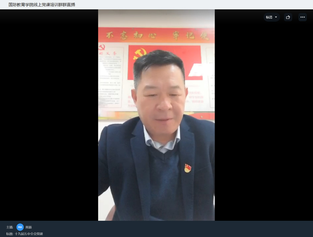 党的十九届五中全会是在当今世界正经历百年未有之大变局、“两个一百年”奋斗目标的历史交汇点上召开的一次具有全局性、历史性意义的重要会议。学习好、宣传好、贯彻好党的十九届五中全会精神,是当前和今后一个时期的重大政治任务。2021年3月8日,通过钉钉线上平台,国际教育学院党委王龙辉书记开展了以“绘就新蓝图,奋进新征程”为主题的十九届五中全会精神宣讲。全体党员、入党积极分子、入党申请人参加了本次宣讲。