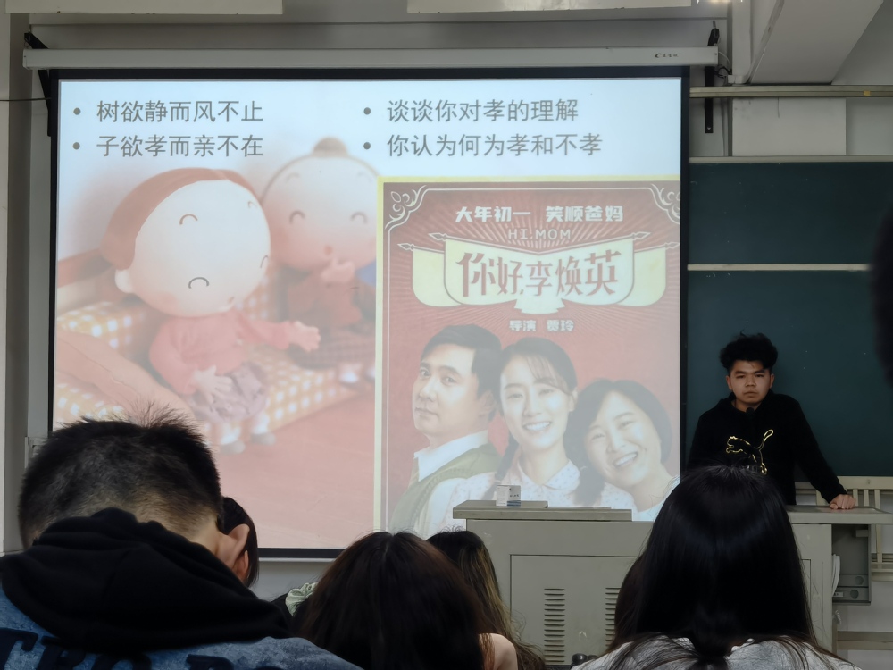 百善孝为先,首先孙老师结合亲身经历强调了孝对大学生的重要性和必要性,更是每一个人都应该拥有的美好品质。接着邀请了两位同学上台谈谈对孝的理解,结合实际情况,不仅让同学们学习到与父母沟通的有效方法,还让他们对孝有了更加深刻的了解。孝是中华民族的传统美德,是同学们在当今以及未来学习和生活中不可缺少的品质。此次班会让同学们对孝有更多的了解,作为大学生应该履行孝的责任和义务。最后,孙老师强调了坚定理想信念的重要性,提醒同学们注意人生财产安全,防止非法宗教的渗透,防诈骗;孙老师还强调了本学期的任务,希望同学们确定新学期新目标,在新学期有更大的进步。