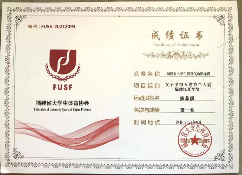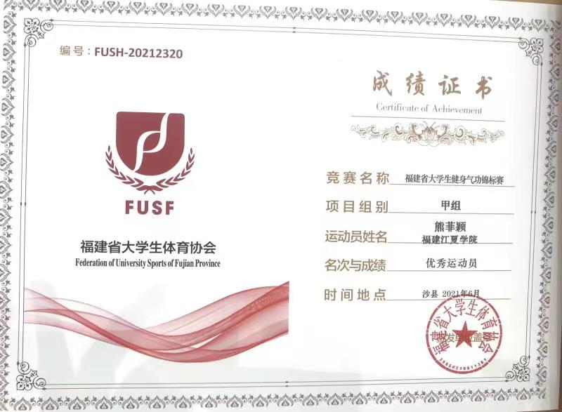 我院17级HND国际经济与贸易专业的熊菲颖同学代表福建江夏学院健身气功队,在比赛中表现出色,以优异的成绩、稳健的步法赢得了女子甲组五禽戏第一名、甲组集体易筋经第一名、甲组集体马王堆导引术第一名,甲组团体总分第一的好名次。熊菲颖同学是第二次参加此类赛事,在2019年全国赛的时候熊菲颖同学获得过全国高校健身气功锦标赛五禽戏第五名,集体易筋经一等奖。今年熊菲颖同学积极参加福建省大学生健身气功锦标赛,在训练中刻苦认真,用拼搏和汗水换来优异的成绩,为学校和学院争光。
