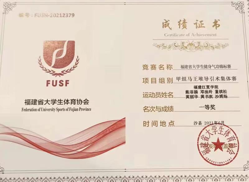 为促进健身气功在全省高等院校的普及推广,弘扬中华优秀传统文化,加强全省高等院校健身气功运动队伍的建设,2021年6月4至7日,“庆祝中国共产党成立100周年2021年福建省大学生健身气功锦标赛”在福建省沙县举行,该赛事由厦门大学,福州大学等28支高校代表队等200多人参加。此次赛事我校健身气功队共获得七个第一名,一个第二名,一个第三名的好成绩。
