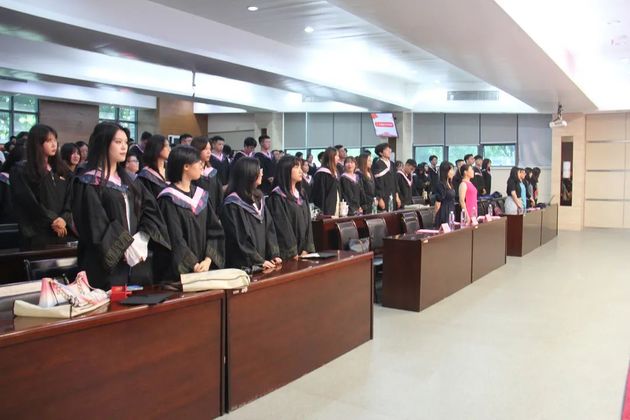 毕业典礼在雄壮的国歌声中拉开序幕。首先,黄颖副书记宣读了优秀毕业生表彰名单。随后,毕业生代表、教师代表、辅导员分别上台发言。陈钒同学总结了四年来所学知识,深切表达对学院领导、老师的感激之情和对同学的不舍之情,以及即将踏入社会的坚定信心;赖慧文老师和孙文霞辅导员表达了全体教师对学生的关心与殷切期望。最后,吴国平院长致辞,回顾了同学们大学四年的精彩表现和取得的巨大进步,在临别之际给大家提出了殷切期望和要求。毕业典礼在欢快的校歌中结束。