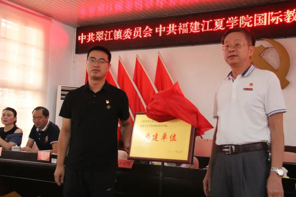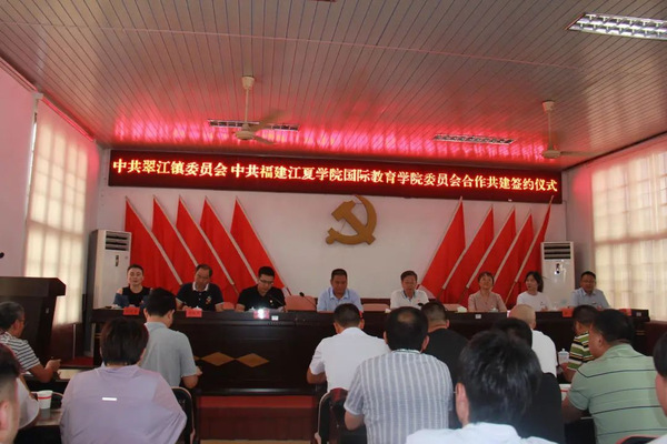 为深入贯彻落实习近平新时代中国特色社会主义思想和党的十九大、十九届二中、三中、四中、五中全会精神,扎实推进“学党史、悟思想、办实事、开新局”党史学习教育,2021年7月17日,国际教育学院党委与宁化县翠江镇党委在镇政府会议室举行了党建共建合作签约仪式.签约仪式由翠江镇党委副书记,镇长候选人张清山主持。翠江镇党委书记杨家海和吴国平院长分别就翠江镇基本情况和福建江夏学院国际教育学院基本情况进行了简要介绍,并代表双方签订《党建共建协议书》。
