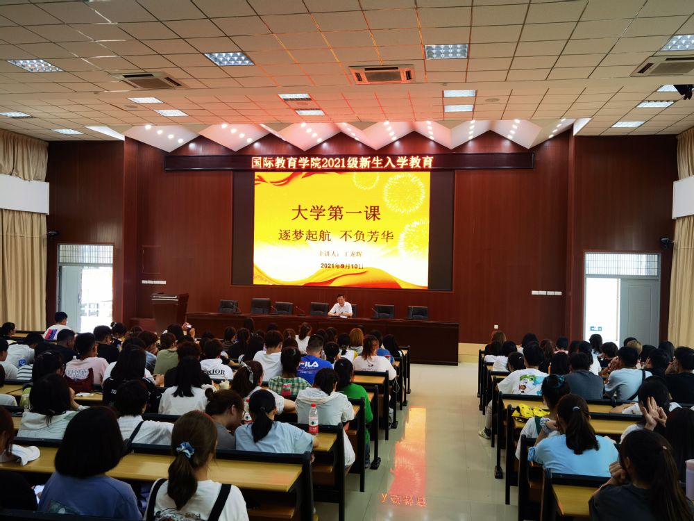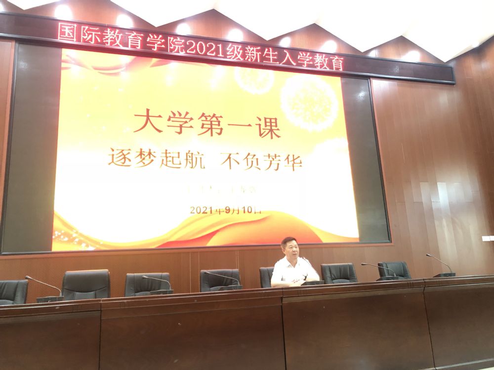 为深入学习贯彻习近平新时代中国特色社会主义思想和“七一”重要讲话精神,持续推动党史学习教育,扎实做好2021级新生入党启蒙教育工作,9月10日下午,国际教育学院党委王龙辉书记面向2021级新同学开展题为“逐梦启航,不负芳华”的入学专题教育。王龙辉书记从大学生的大学目标为切入点,要求每一位新生同学做好人生规划,自强不息,逐梦启航;要求每一位新生同学扣好人生的第一粒扣子,严格要求自己,不断提高自己的政治思想觉悟;要求每一位新生同学注重英语学习的重要性为今后的出国、考研奠定扎实基础。最后王书记勉励全体同学要牢记习近平总书记嘱托,做到将爱国、爱党与爱社会主义相统一,将个人理想与祖国前途、民族命运相联系,要志存高远,脚踏实地,不懈奋斗,以昂扬姿态奋力开启全面建设社会主义现代化国家新征程。