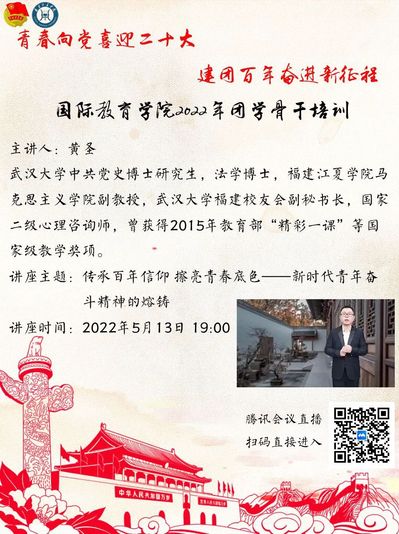 5月13日晚,国际教育学院团委邀请了福建江夏学院马克思主义学院的副教授黄圣老师以“传承百年信仰擦亮青春底色——新时代青年奋斗精神的熔铸”为主题开展2022年“青春向党喜迎二十大,建团百年奋进新征程”团学骨干培训班的第四次专题讲座。