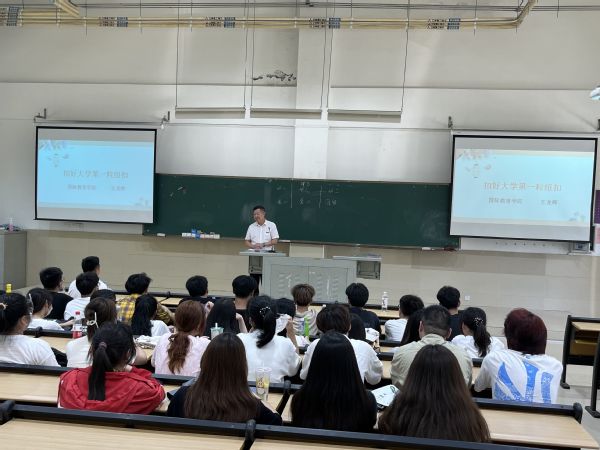 国际教育学院党委高度重视新生入学教育,把新生入学教育视为整个大学教育的起点,是加强和改进学生思想政治教育的一项关键性基础工作。9月4日下午,学院党委王龙辉书记在7C208教室以《扣好大学第一粒纽扣》为题开启了2022级新生入学教育的第一课。国际教育学院2022级212名全体新生参加了本次新生入学教育活动。