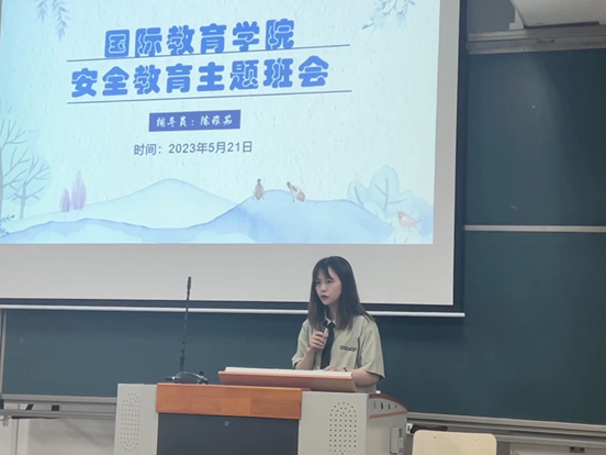 为落实学校有关部门对于安全教育工作的部署,切实加强学院同学们安全防范意识和自我防护能力,有效预防化解各类学生安全事故风险,确保同学们身心健康和生命安全,2023年5月21日,国际教育学院辅导员陈雅茹、朱佳彬和林榕馨老师组织所带班级召开了安全教育主题班会。