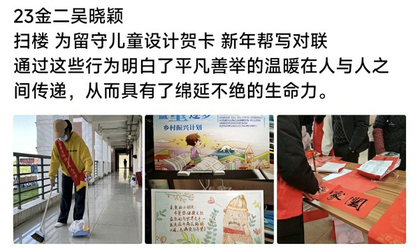 3月1日至3月4日,国际教育学院举办了“雷锋行动代代传,日行一善暖人心”善举记录活动。活动期间,同学们通过学院团委青年志愿者协会建立的打卡活动群将自己的善举进行拍照记录,并自主选取他们认为最有意义的三张图片发送至群相册进行打卡。