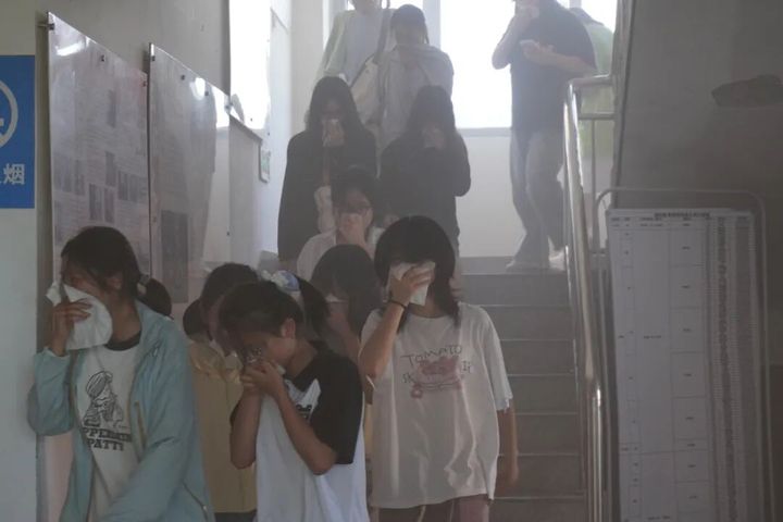演练前期筹备工作周密有序。第一次哨声响起,提示同学们做好准备,进入待命状态;第二次哨声标志着演练正式启动。全体参演学生迅速用湿毛巾捂住口鼻,弯腰低姿,沿预定安全路线快速有序撤离宿舍楼,并统一前往生活区新舞台集合。