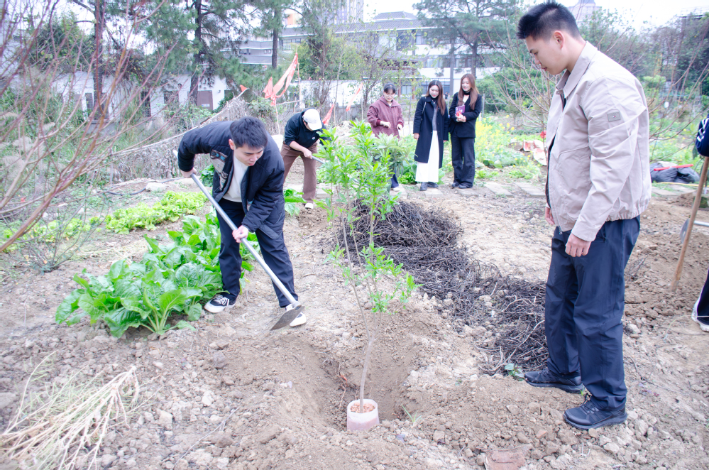 当天,学院党委书记王龙辉、党委副书记陈志兴,团委负责人林榕馨、辅导员严浩然与校友、在校学生代表一同走进“开心农场”,开展“同植一棵树·共寄江夏情”植树活动,大家携手栽下新苗,让绿意在校园沃土中生根发芽。